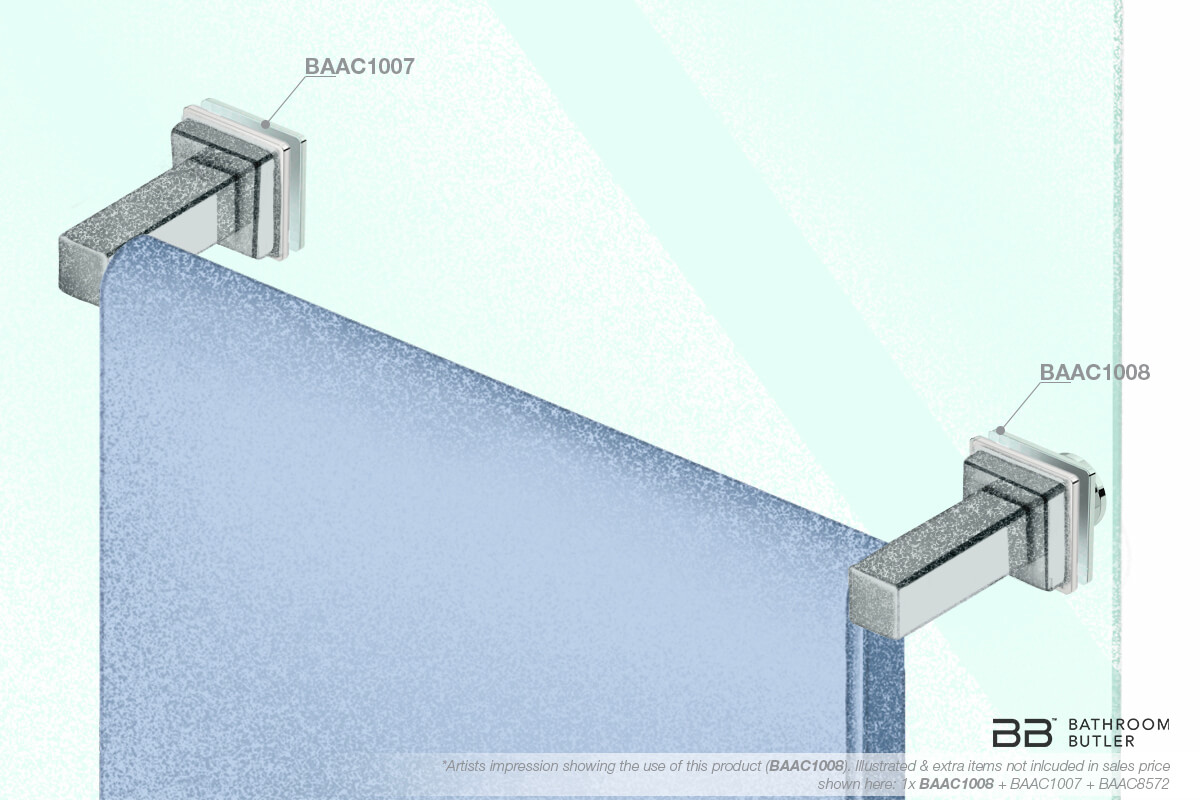 Problem: No space in the bathroom to install a towel rail? Solution: With our glass mountings, you can install our Bathroom Butler towel rails directly onto the glass shower door.This glass mounting allows for a Bathroom Butler bathroom accessory to be installed on the one side and a Pull Knob on the other side. It is important to remember that it is best to drill the 8mm hole in the glass before toughening.