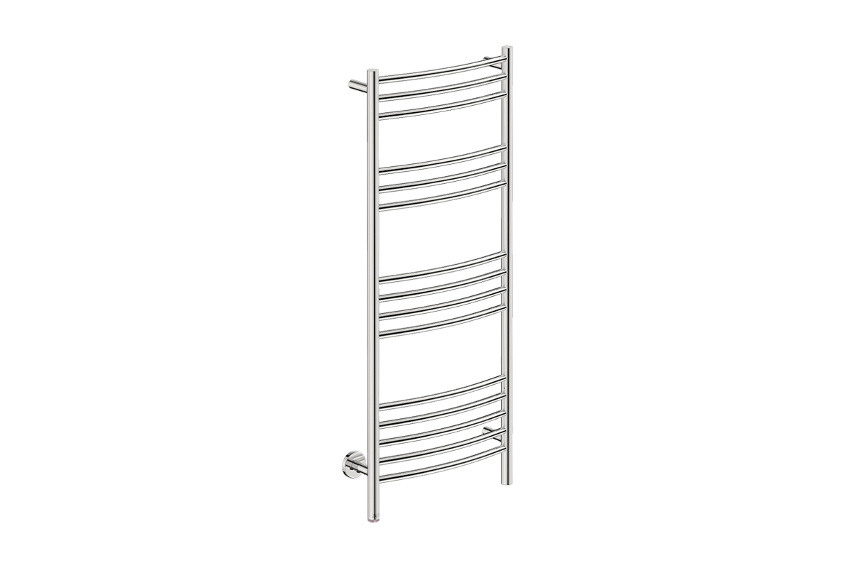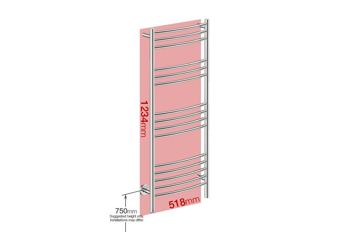 An eye-catching round bar design, 500mm wide with curved horizontal bars creating more depth for thicker towels. This heated towel rail is best suited for a main or family bathroom and can dry 3 bath sheets. Use the built-in rotary switch to set the temperature of your rail lower or higher and turn it on and off as needed.