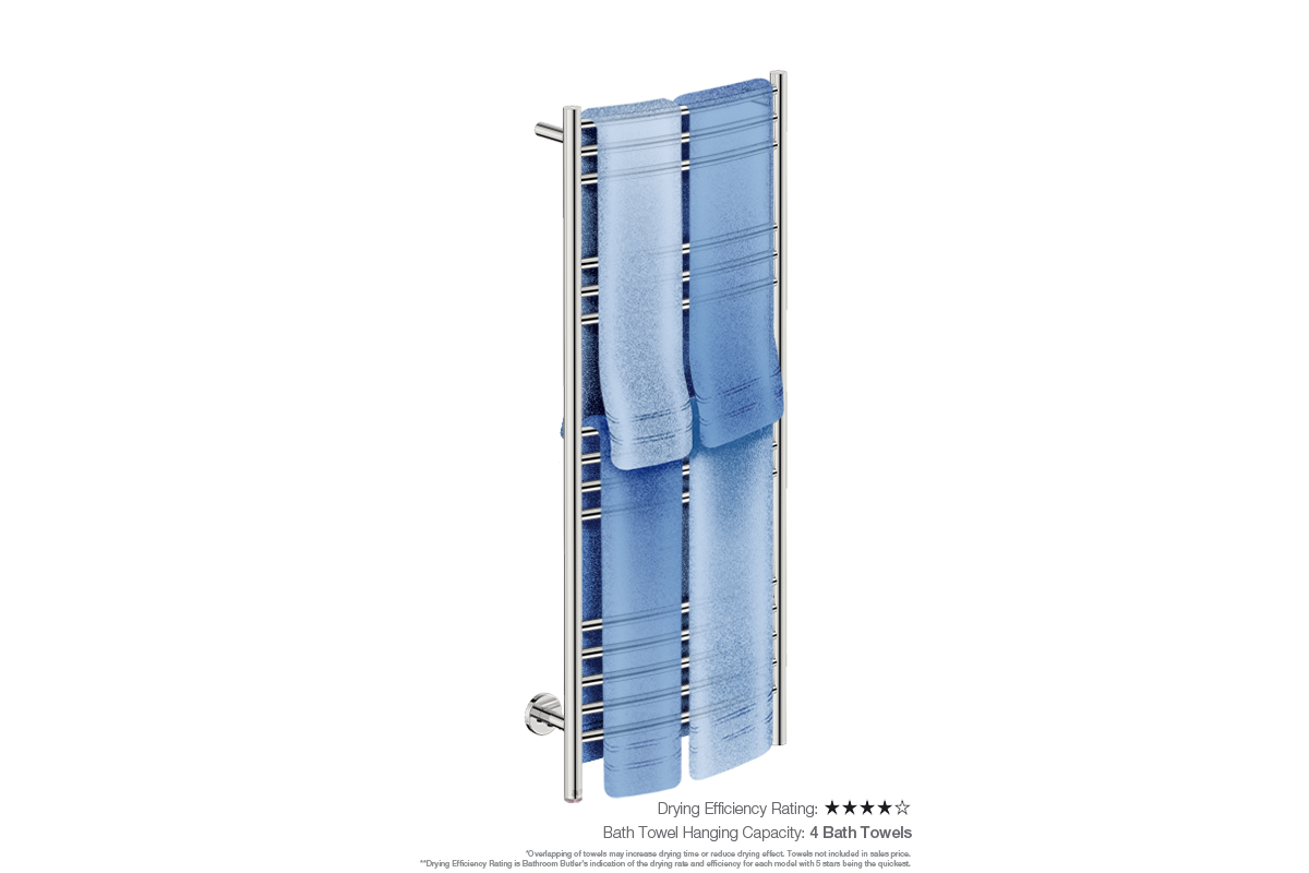 Towel Holding Capacity: This model has the capacity to dry 3 x folded bath sheets or 4 folded bath towels.