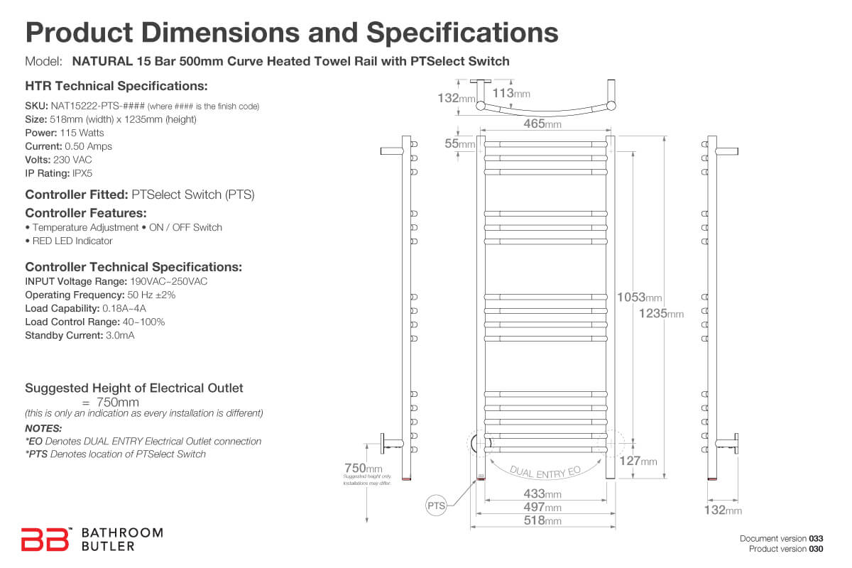 NATURAL 15 Bar 500mm Curved Heated Towel Rail with PTSelect Switch