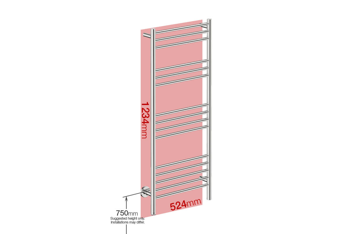 An eye-catching round bar design, 500mm wide with straight horizontal bars. This heated towel rail is best suited for a main or family bathroom and can dry 4 bath towels. Use the built-in rotary switch to set the temperature of your rail lower or higher and turn it on and off as needed.