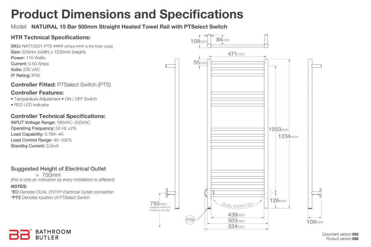 NATURAL 15 Bar 500mm Straight Heated Towel Rail with PTSelect Switch