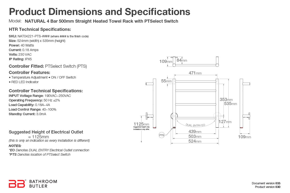 NATURAL 4 Bar 500mm Straight Heated Towel Rail with PTSelect Switch