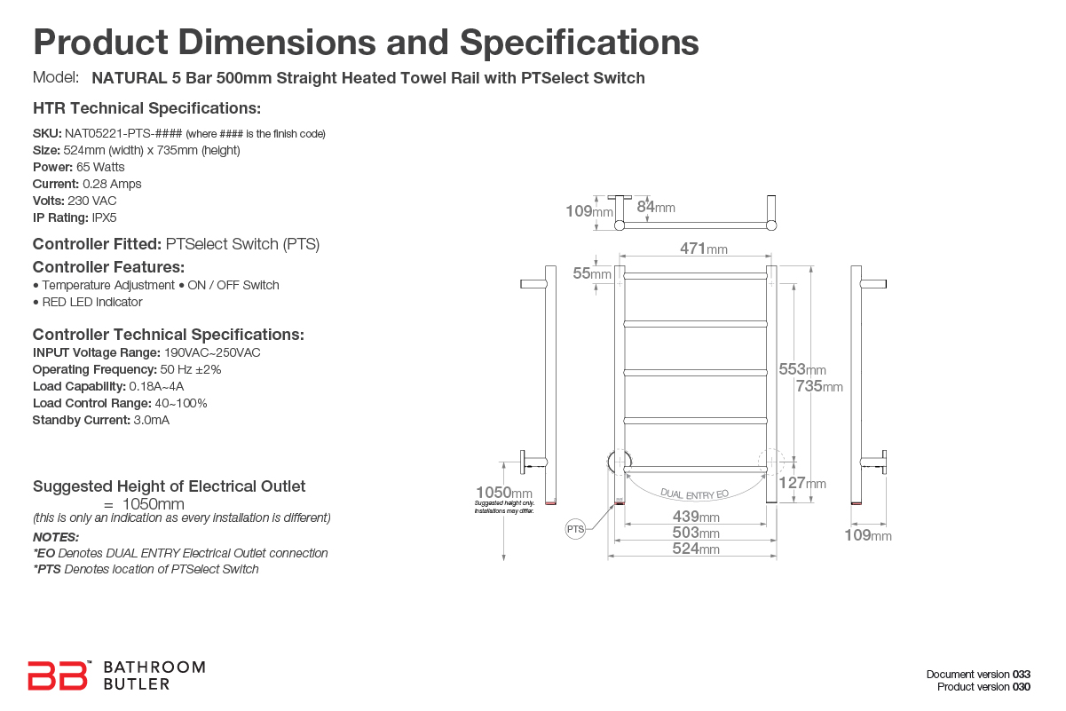 NATURAL 5 Bar 500mm Straight Heated Towel Rail with PTSelect Switch