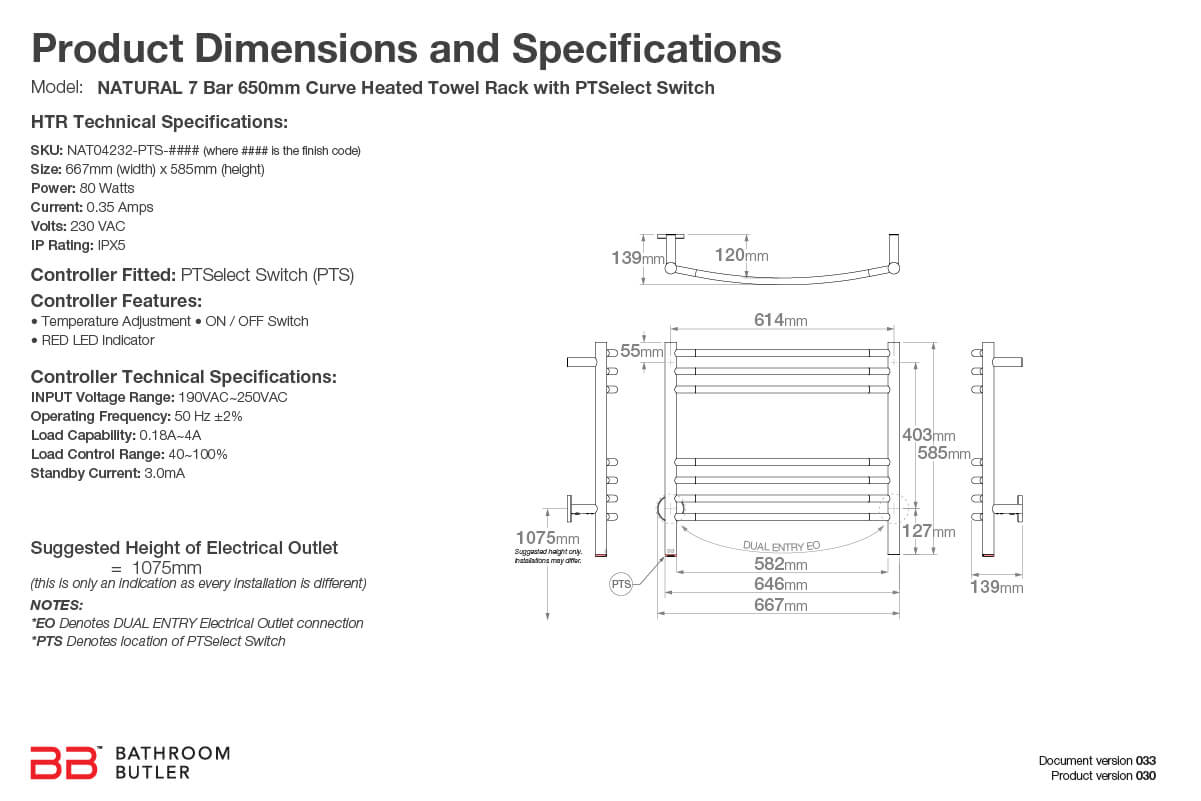NATURAL 7 Bar 650mm Curved Heated Towel Rail with PTSelect Switch