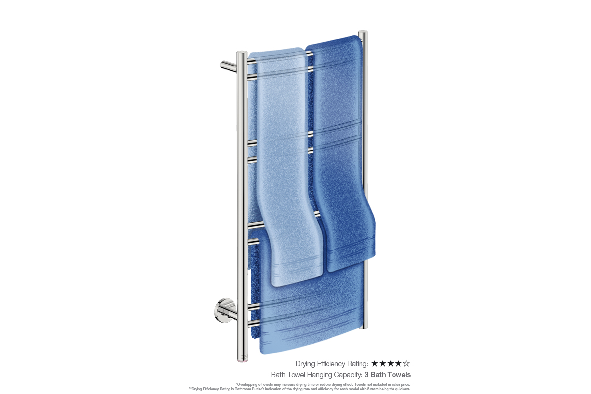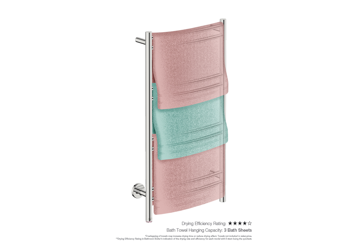 Towel Holding Capacity: This model has the capacity to dry 3 x folded bath sheets or 3 x folded bath towels.
