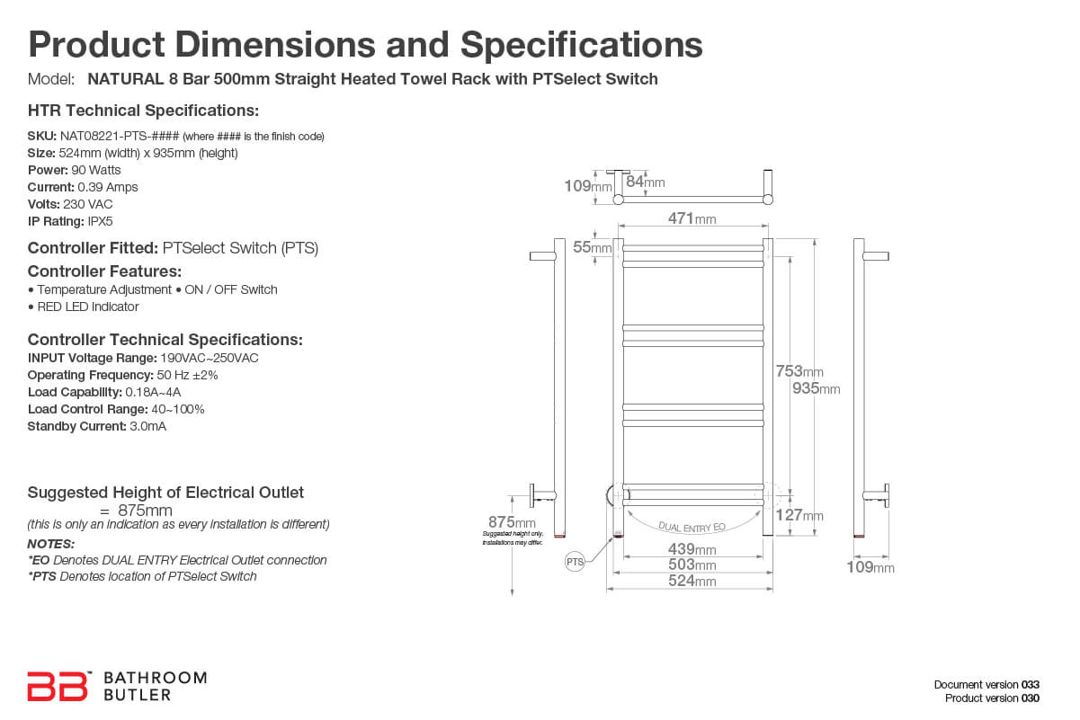 NATURAL 8 Bar 500mm Straight Heated Towel Rail with PTSelect Switch
