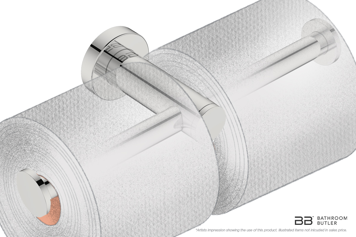 This stainless steel double toilet paper holder has a round design that is functional and timeless. It’s designed with a second arm, to hold and store an additional standard paper roll, making it a perfect choice for guest toilets. The open design on both sides allows for easy roll changes and features a round disc stopper at each end to prevent your paper rolls from slipping off when pulling on the paper. Installed with our RIGID Loc mounting, guarantees a toilet roll holder that will remain securely in place.