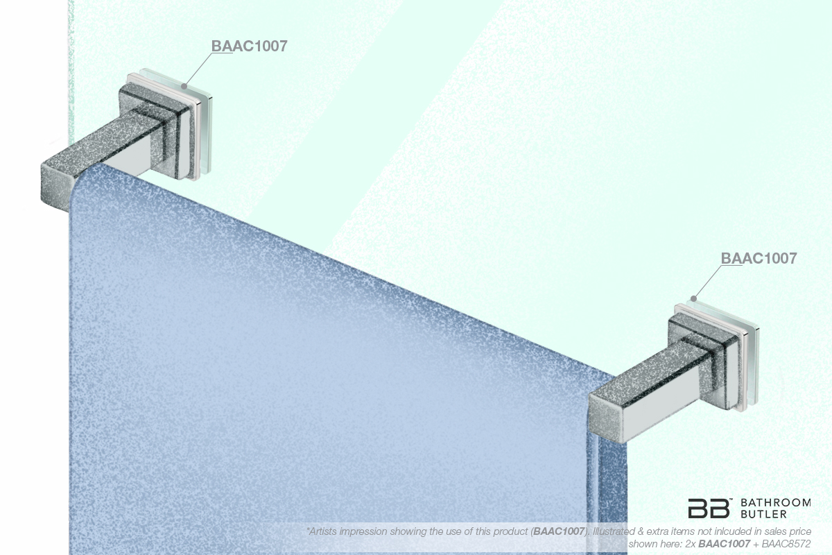 Glass shower doors and enclosures are especially popular and stylish; Bathroom Butler offers designers and homeowners the perfect opportunity to be creative by installing their bathroom accessories onto glass showers with our unique glass mounting brackets. These are also ideal for smaller bathrooms that are limited on wall space. This glass mounting allows for a bathroom accessory to be installed on the one side while on the other there is a blanking disc. It is important to remember that it is best to drill the 8mm hole in the glass before toughening.