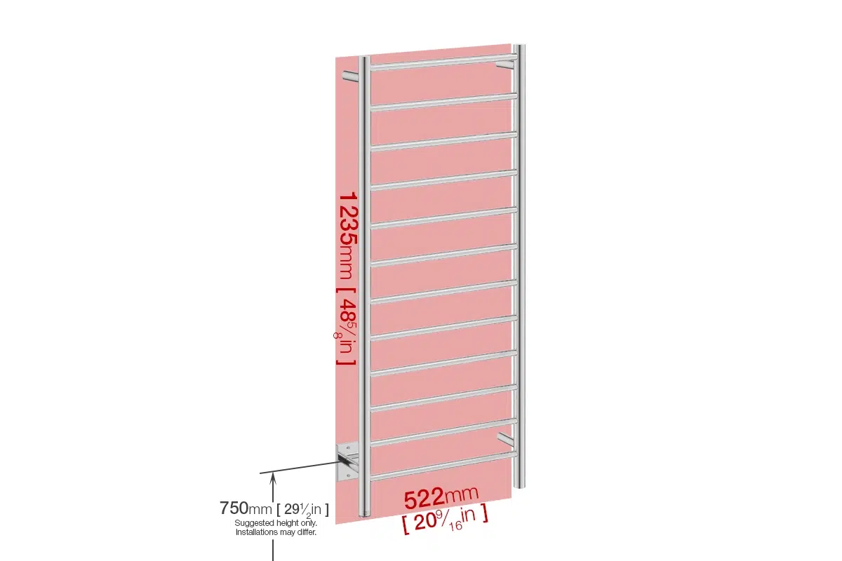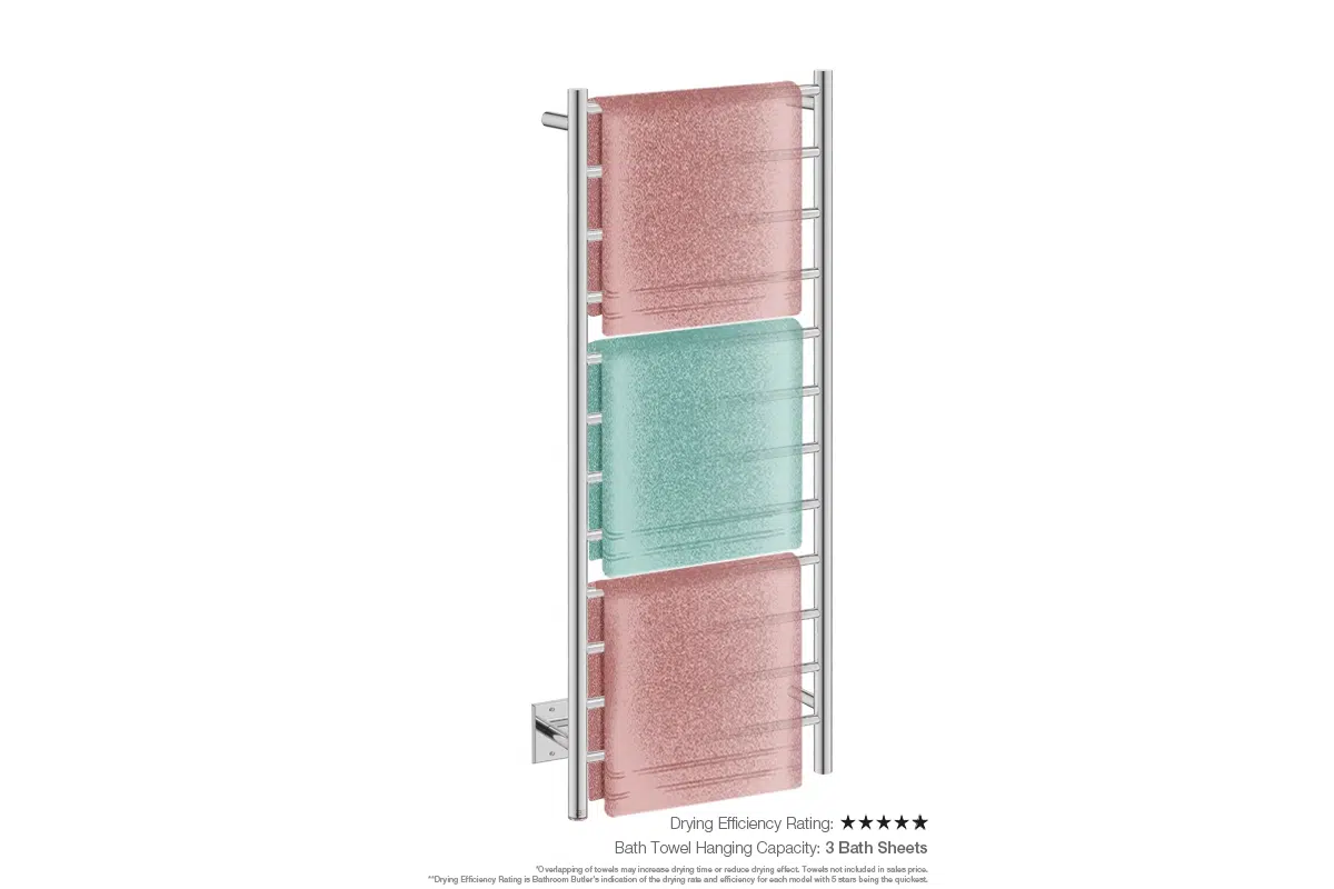 Experience a transformative bathing or showering moment with the assurance of dry and hygienic bath towels. With the NATURAL 12 Bar 20-inch wide heated towel rack, say goodbye to cold, damp, and musty towels. Its evenly spaced bars accommodate both bath sheets and towels with ease. Crafted from Grade 304 stainless steel, this rack is not only resistant to rust, peeling, chipping, and staining but is also exceptionally suited for bathroom conditions. It’s also easy to clean, just use a warm , damp cloth, no detergent or chemicals necessary.