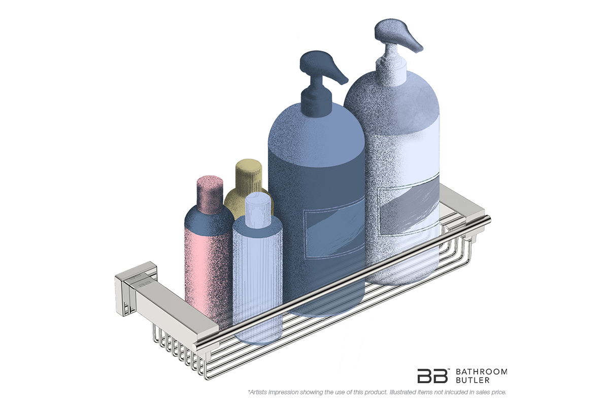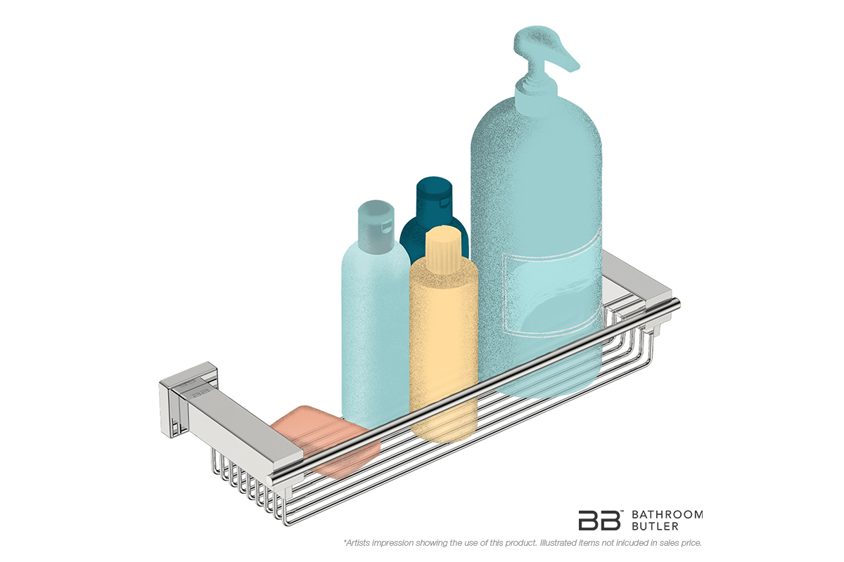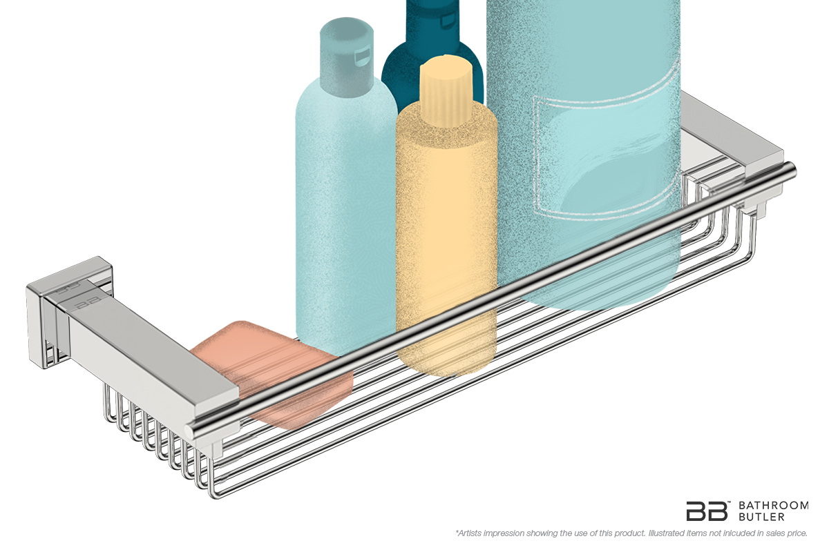 The contemporary design of the 8600 series shower rack makes it the perfect addition to any modern bathroom design. The round bars of the grid-style base is molded in keeping with the square design. The stylishly placed round bottle bar that is secured to the front of the square side posts is to prevent your bathroom essentials from falling off the shower rack and the evenly spaced bars provide much needed water drainage.