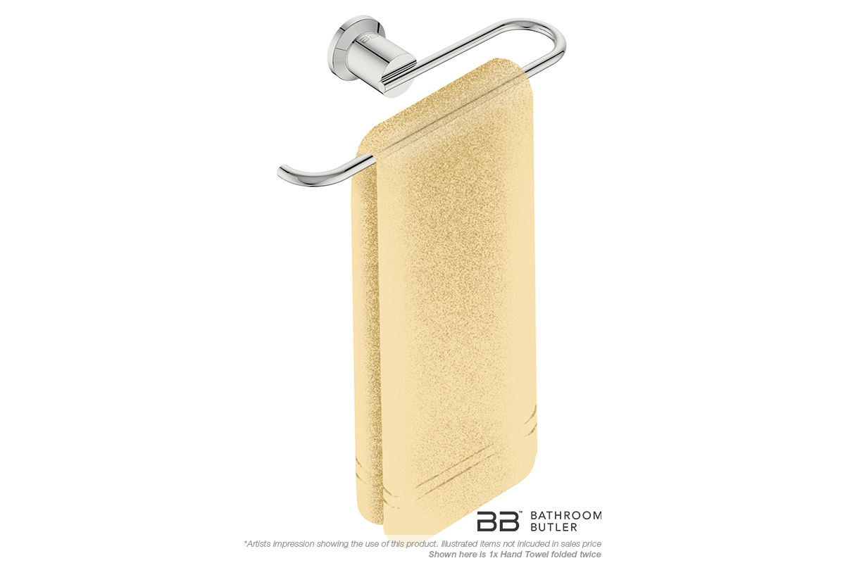 This open stainless steel towel ring is unique in its design with features to match other items in this series and complementing contemporary bathroom styles. With its round bold and finer crossbar detail, it is designed to hold one hand towel on a curved arm that remains fixed in position.